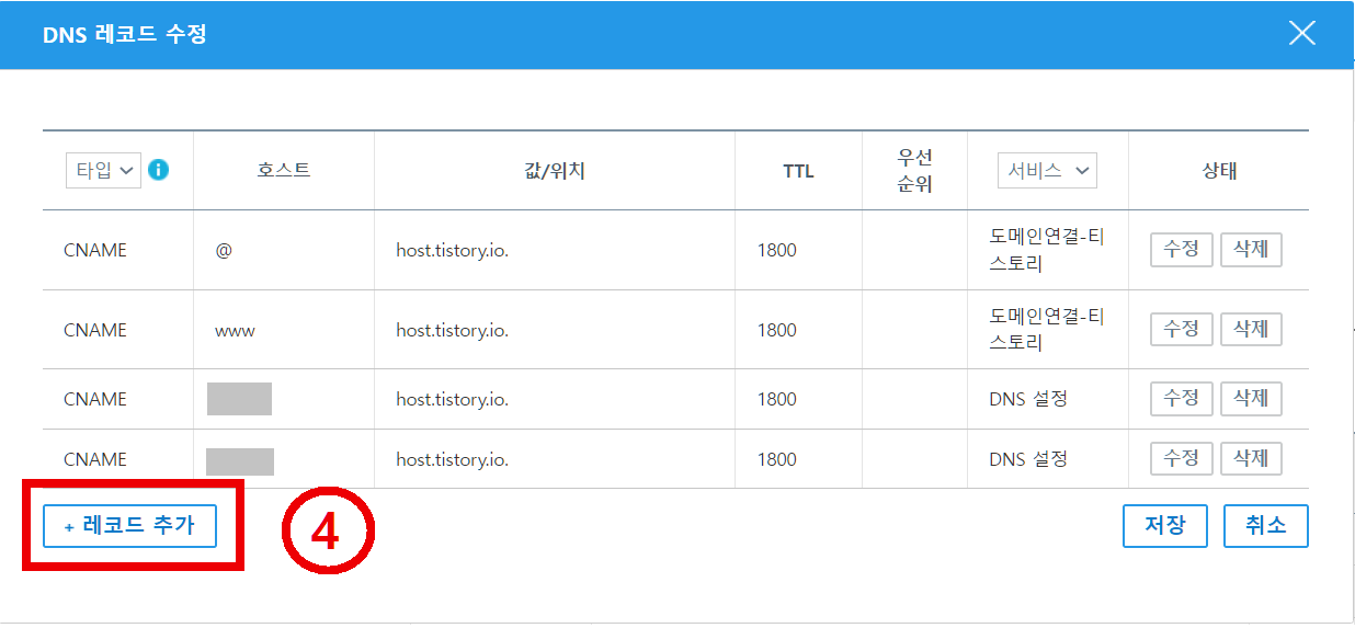 ④ DNS 레코드 수정 창이 새로 뜨면 하단의 "레코드추가" 버튼을 클릭합니다.